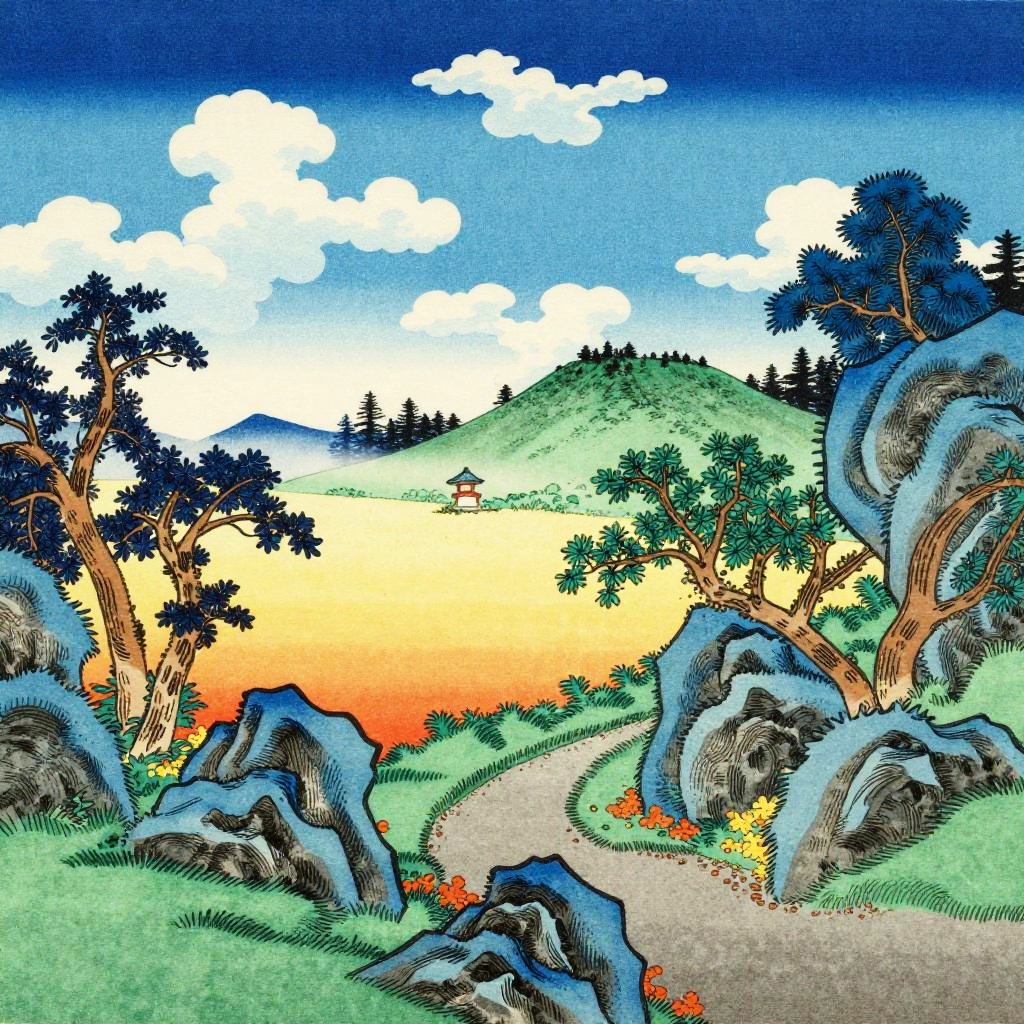 Traditional ukiyo-e woodblock print landscape set in tranquil temple garden in autumn, bright blue sky with fluffy clouds. Oversized blue-tinted shapes frame a rocky path winding into a glowing golden field; a small landmark rests on a distant hill amid lush greenery. Saturated palette, crisp outlines, dithered textures, soft bloom, subtle fog, playful particles, storybook charm, harmonious and reflective.
