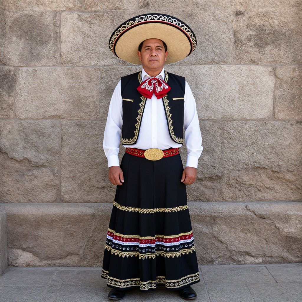 Photograph of a man standing against a stone wall. He wears a traditional Mexican outfit: a large, black sombrero with white trim, a white long-sleeve shirt, black vest with white and gold embroidery, and a black skirt with intricate red and white patterns at the hem. A red bow tie and a wide, yellow belt with a large, circular buckle are also part of his attire. The man has a medium build, light skin, and short dark hair. His expression is neutral, and he stands with his hands by his sides. The stone wall behind him is textured and gray.