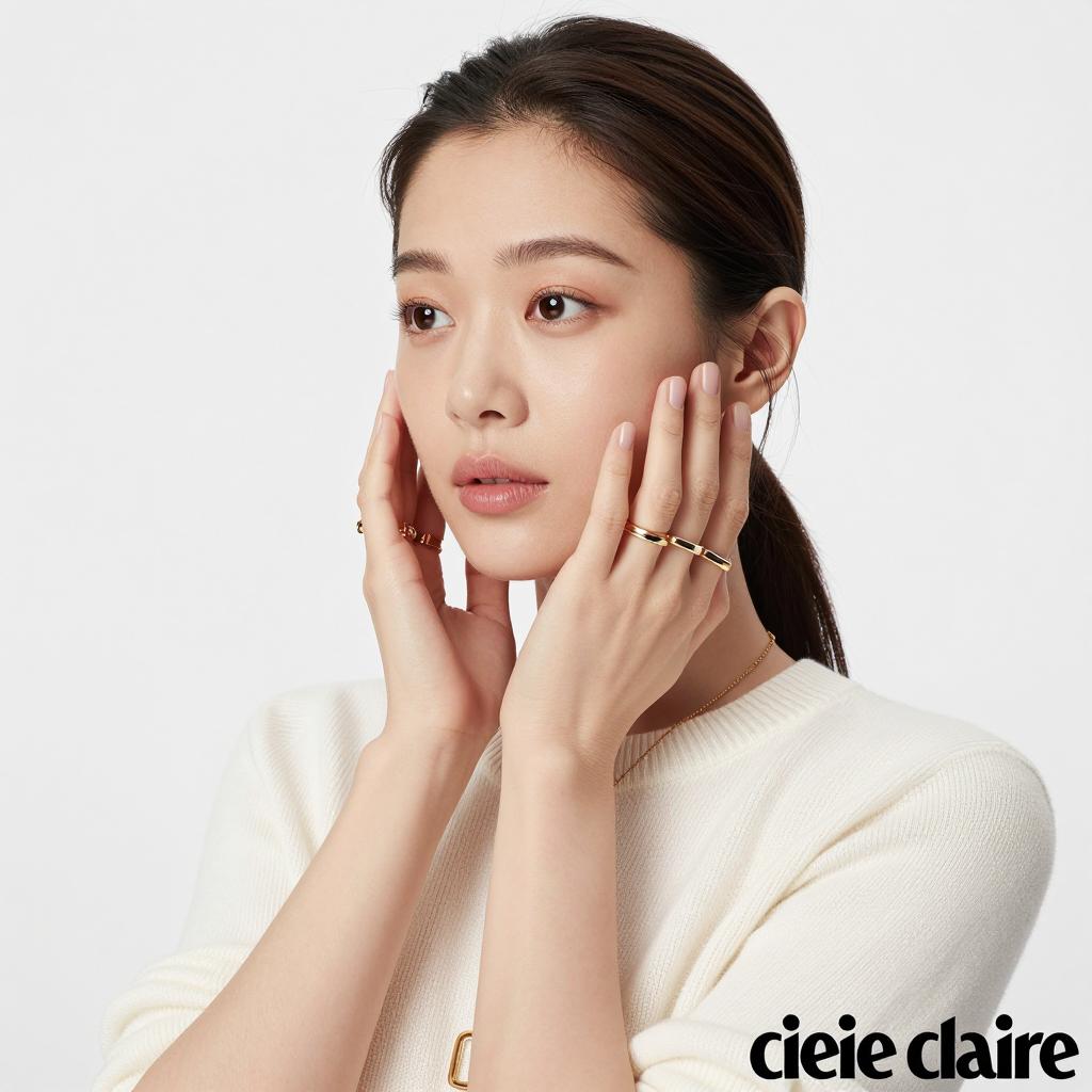 Asian woman with black bob haircut, wearing white sleeveless top, silver necklace, earrings, ring, and bracelet, hands covering eyes, neutral expression, pale pink eyeshadow, clear background, close-up, minimalist style.