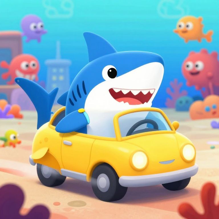 Cartoon blue shark driving a yellow toy car underwater, surrounded by colorful animated fish and coral, with a sunny ocean background.