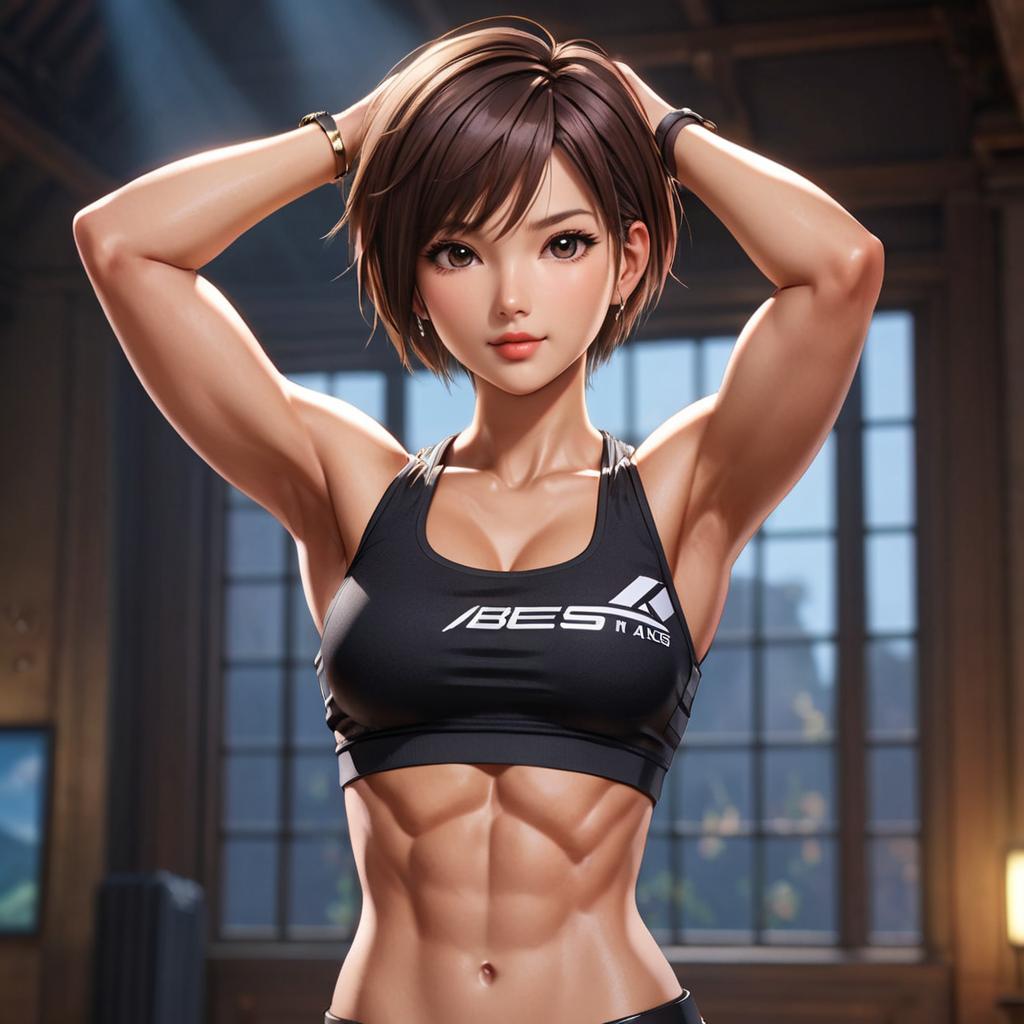 CGI image of a beautiful Asian woman with long brown hair, wearing a blue Adidas sports bra, standing in a sunlit room with trees outside the