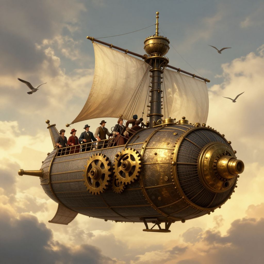 Steampunk airship with golden gears, sail, and crew floating amidst a cloudy sky, birds flying nearby. Digital illustration.