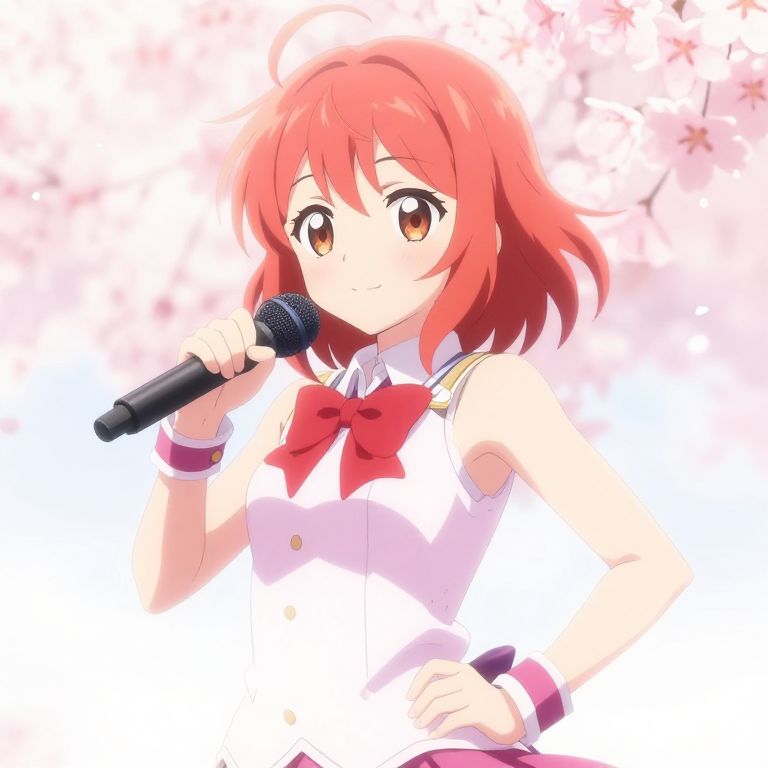 Cute anime girl red hair, smiling brightly with sparkling green eyes, wearing a school uniform in a cherry blossom park, soft pastel colors, detailed background, anime style