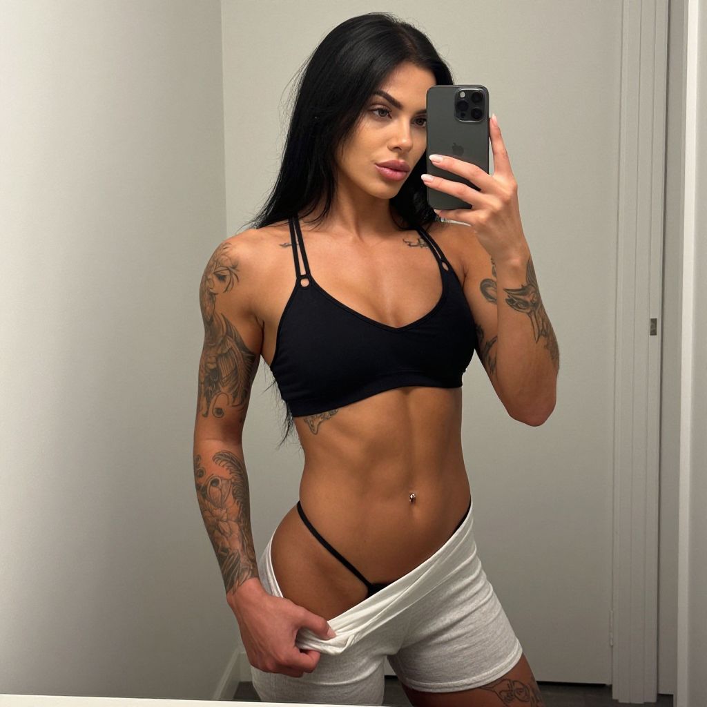 Tattooed woman with long black hair takes a mirror selfie in a white bathroom, wearing a black sports bra and white shorts, showing a toned