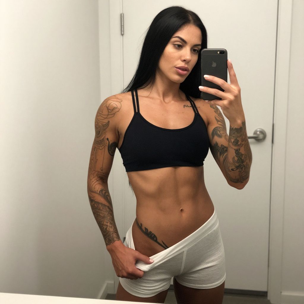 Photograph of a fit, tattooed woman with long black hair, standing in a white-walled room, taking a mirror selfie with a black smartphone. She has fair skin and visible abs, wearing a black sports bra and white, low-rise, slightly pulled-down shorts, revealing a tattoo on her lower abdomen. Her right arm, covered in detailed tattoos, is raised to hold the phone, while her left hand slightly pulls down her shorts. The background includes a white door with a silver handle. The image has a slightly edited, hyper-realistic style.