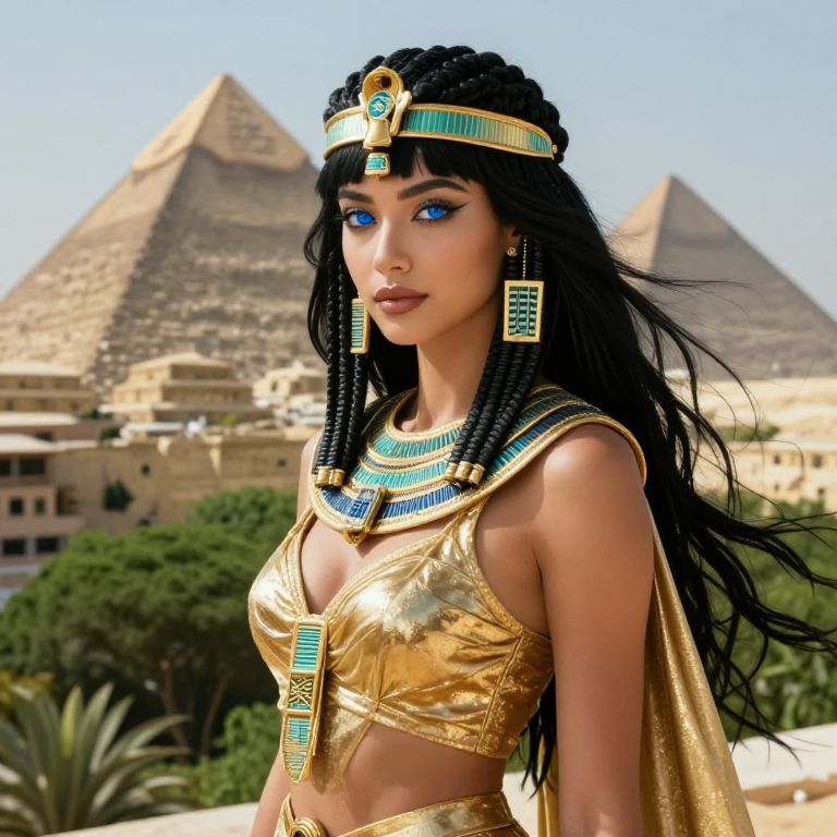 Digital art of an Egyptian woman with black hair, blue eyes, golden top, and blue-green jewelry, standing in front of pyramids.
