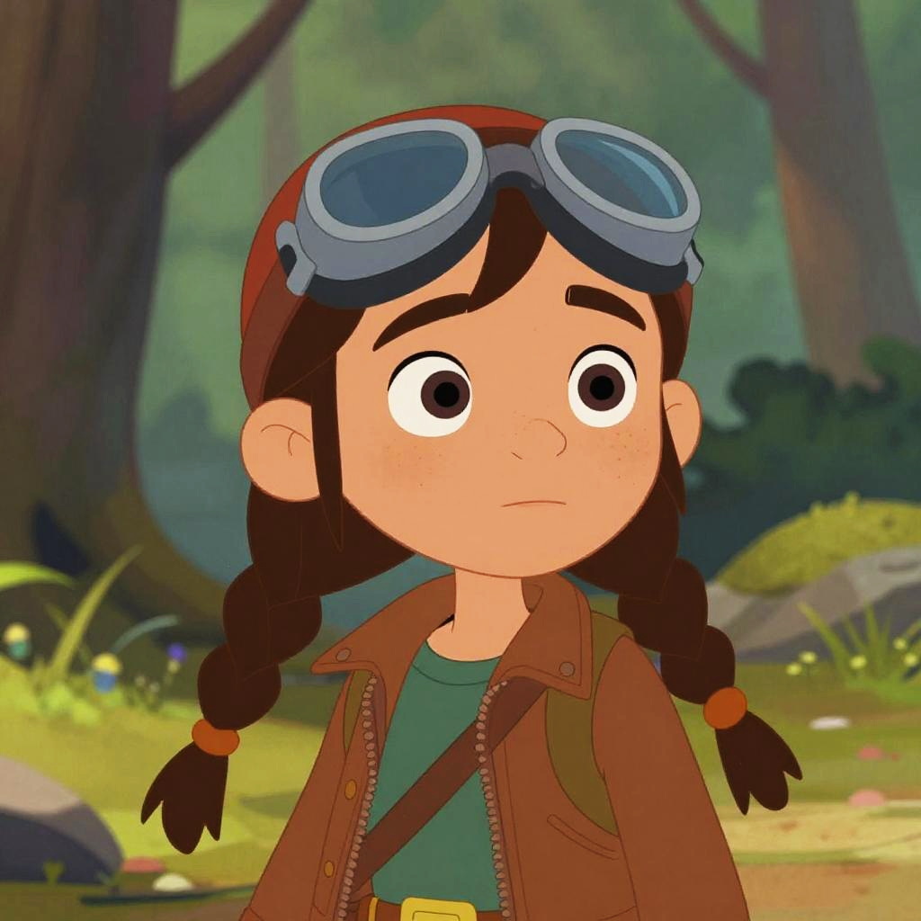 Cartoon girl with brown pigtails, red jacket, green shirt, aviator goggles, serious expression, forest background, digital art style.