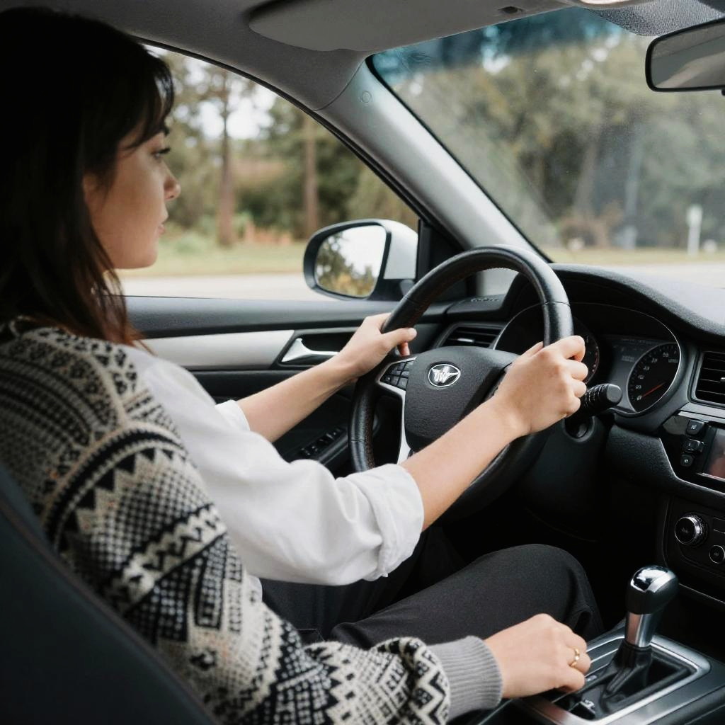 Photograph of a close-up shot inside a car, focusing on a pair of pale hands with purple-painted nails gripping the black leather steering wheel. The hands appear slightly nervous or tense, with visible veins and a subtle tattoo on one finger. The background is dark, with indistinct car dashboard elements. The lighting is dim, highlighting the hands and steering wheel.
