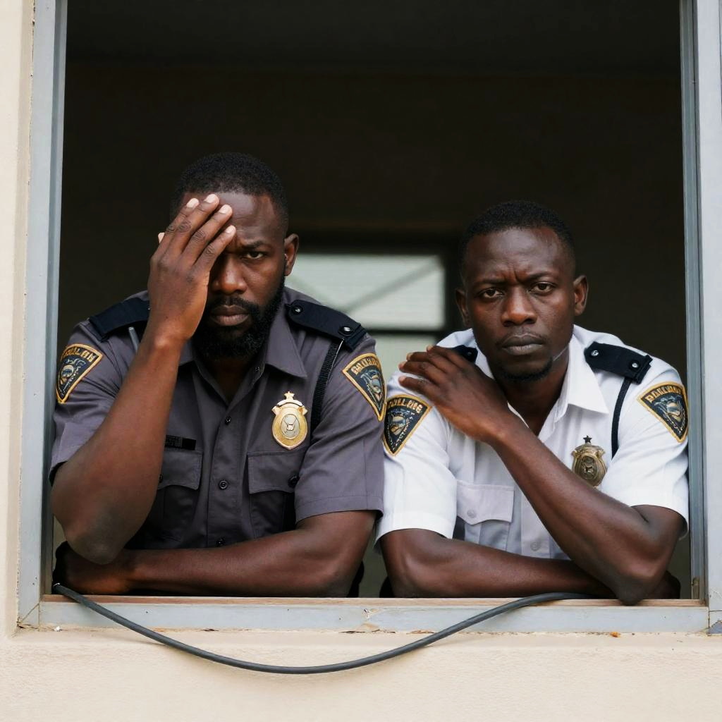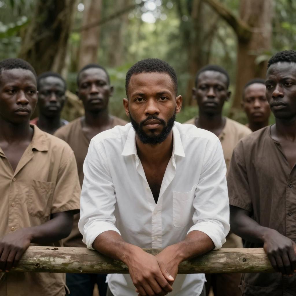 Photograph of six African-American individuals in a forest. Central male with chest hair, white shirt, and serious expression, leans on a wooden fence. Surrounding people, in earth-toned clothing, look at him. Background has green trees with hanging moss.