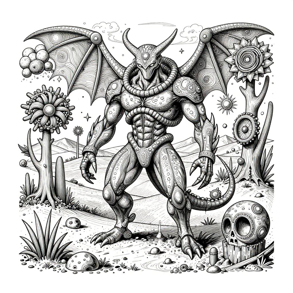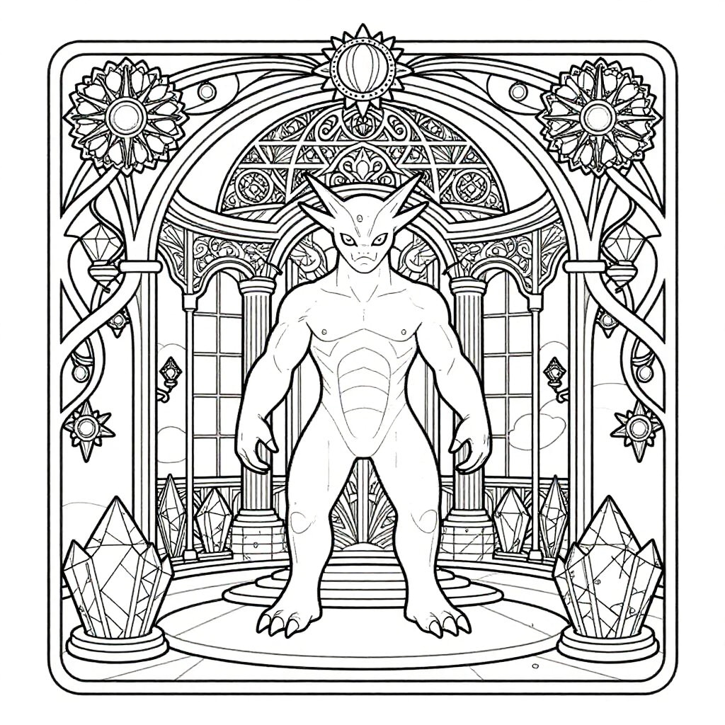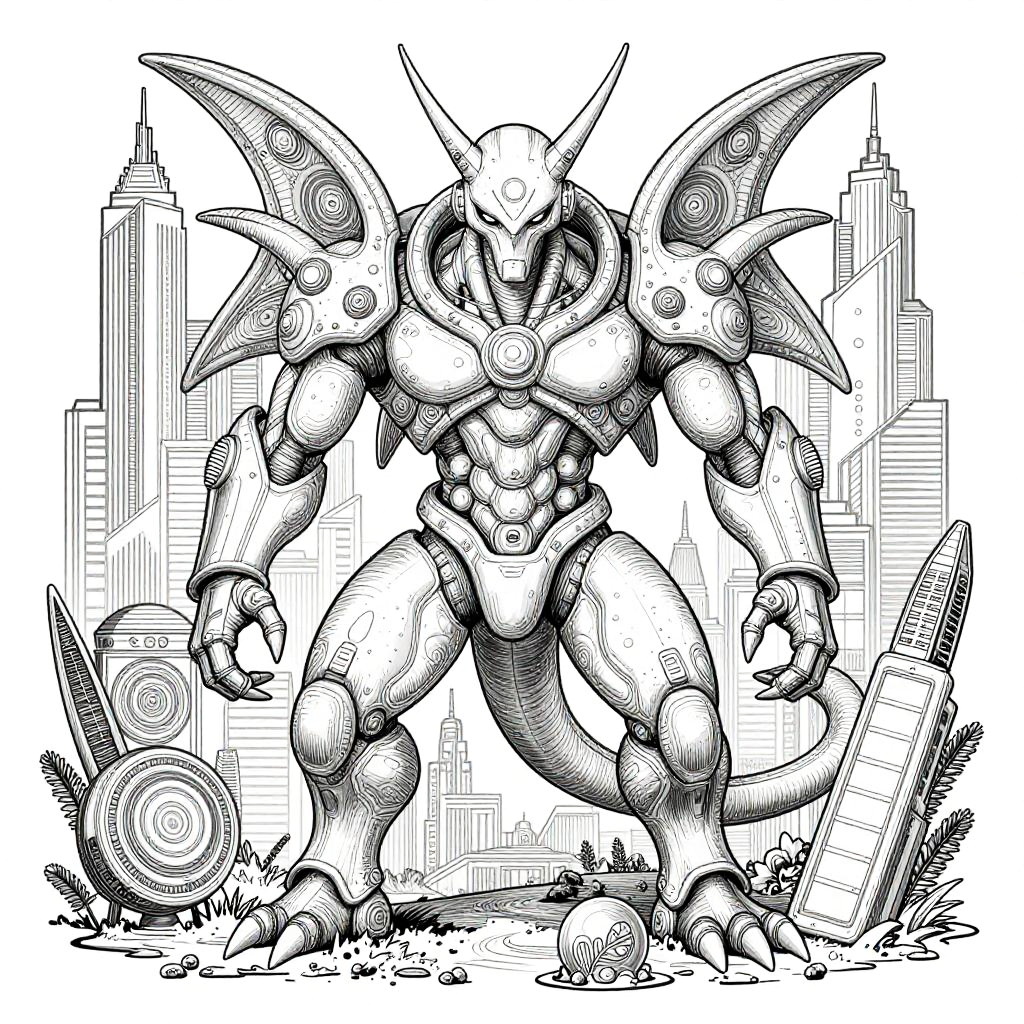 Intricate mewtwo coloring page with art nouveau detailing, featuring a melting clocks