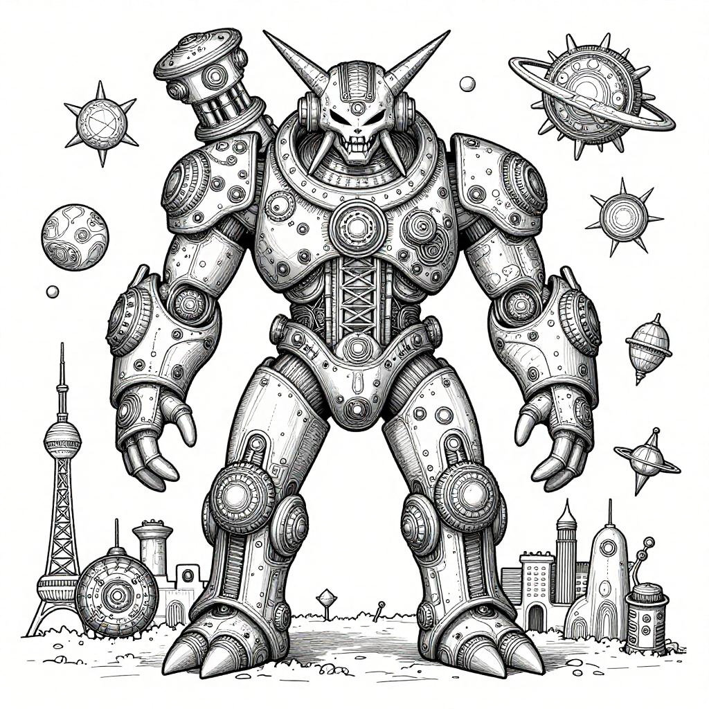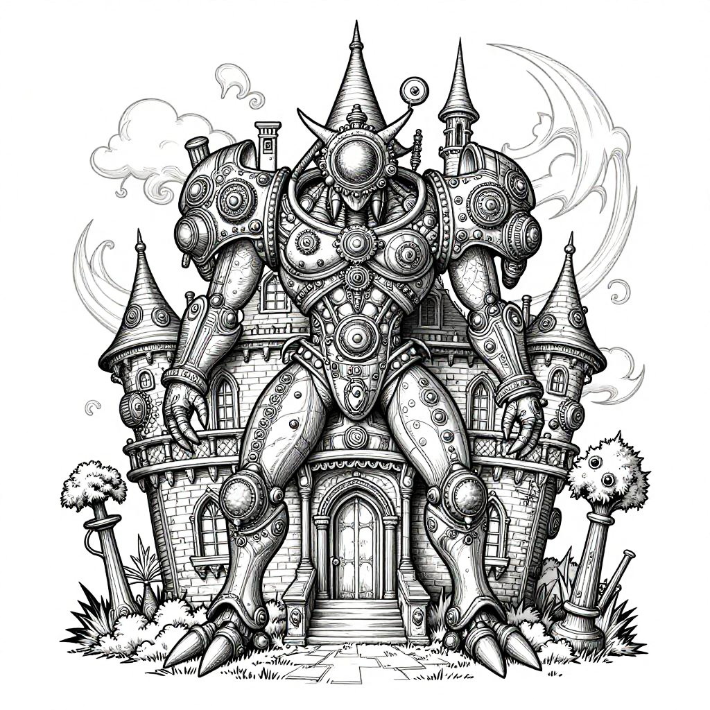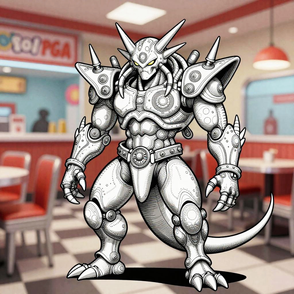 Intricate mewtwo coloring page with art nouveau detailing, featuring a melting clocks