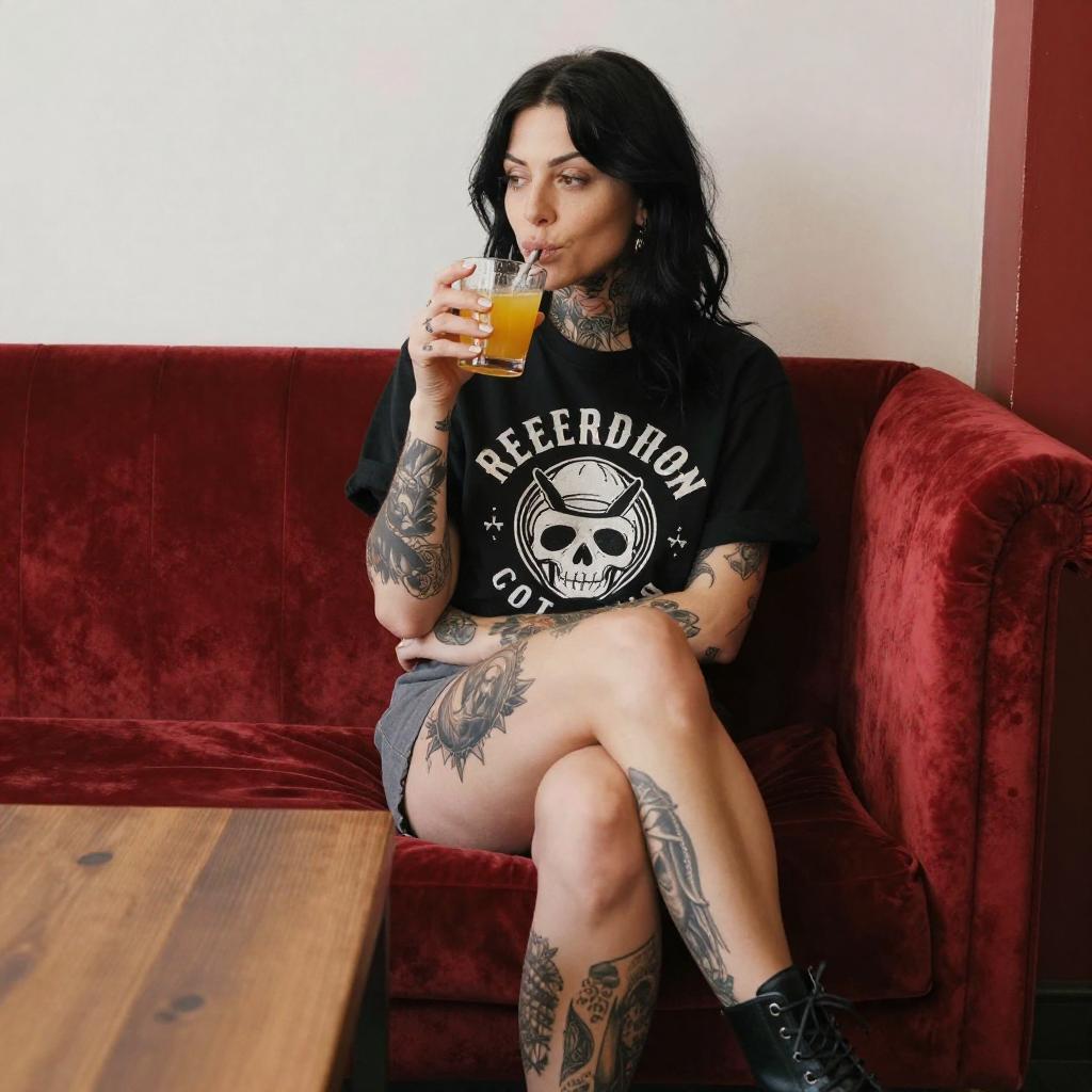 A tattooed woman with long black hair sits on a red velvet couch, holding a glass of orange liquid. She wears a black graphic t-shirt, gray shorts, and black boots. Her arms and legs are heavily tattooed. A wooden table is in front of her. The background features a ured white wall and a red accent.