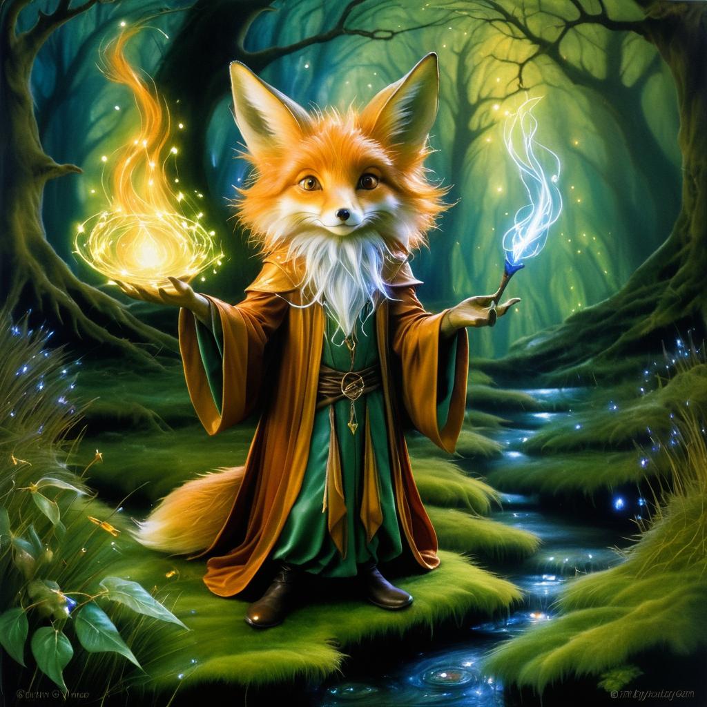 Oil painting of a cunning fox mage casting spells in an enchanted glade, by Brian Froud, fantasy style.