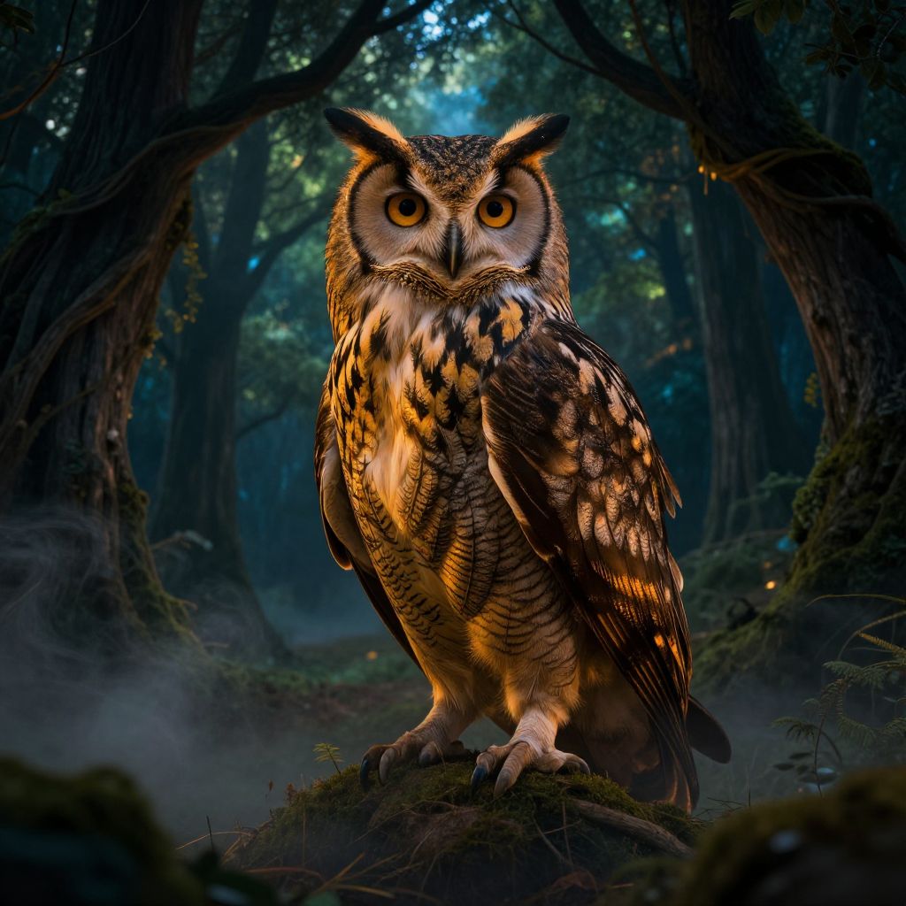 Photorealistic digital artwork of a large, detailed owl standing on a moss-covered log in a dense, dark forest. The owl has striking yellow eyes, brown and white speckled feathers, and a prominent, tufted forehead. Its wings are partially spread, showcasing intricate feather patterns. The forest background is filled with tall, shadowy trees and dappled sunlight filtering through the leaves, creating a mystical, ethereal atmosphere. The owl is centered, with a misty, blue-tinted forest floor adding depth and texture to the scene.