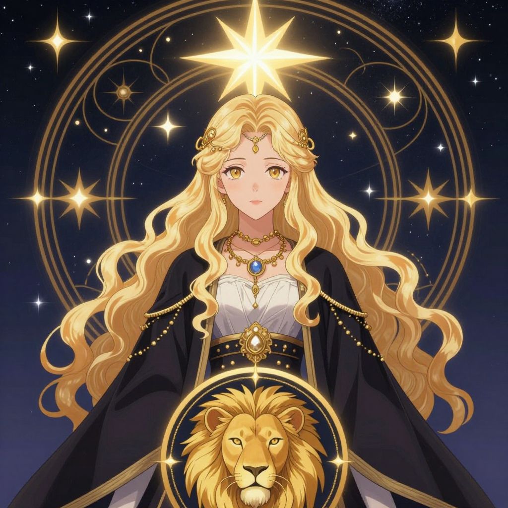 The image depicts an anime-style illustration representing the Leo zodiac sign. The central figure is a young woman with long, wavy blonde hair, adorned with intricate gold jewelry. She is dressed in a dark, flowing robe with a white inner garment, giving her a regal appearance. The background features a starry night sky with a large, glowing star at the center, surrounded by a circular pattern with golden stars and celestial motifs. Below the woman, there is a circular emblem with a lion's head, further emphasizing the Leo theme. The overall composition is rich in detail, with a harmonious blend of colors and textures, creating a sense of depth and complexity. The interplay of light and shadow enhances the visual appeal, making the image both striking and captivating.