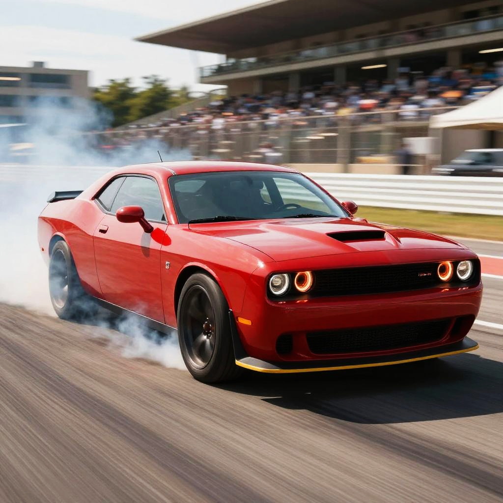 Dodge Demon burnout in action, thick smoke billowing from rear tires, aggressive stance, muscle car in vibrant red with glowing headlights, racetrack background, dynamic motion blur