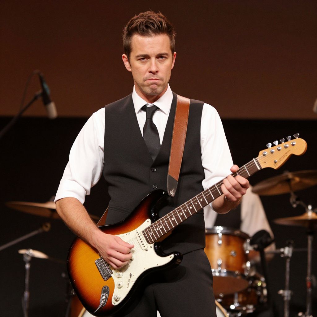 Rocker Costume Man, man in vest and tie holding a guitar in front of a stage