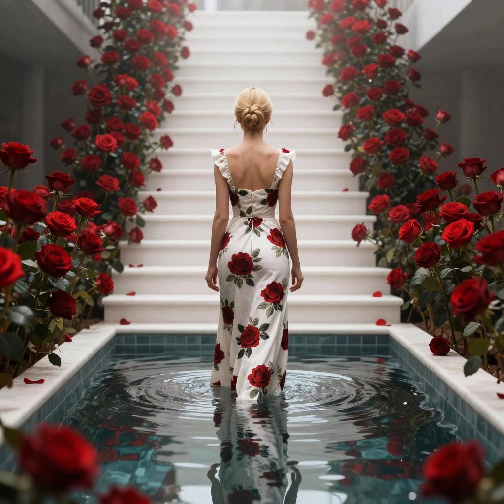 A digital art image shows a woman with a blonde bun standing in a reflective pool, facing away. She wears a white dress with red rose patterns, surrounded by vivid red roses. The background features a white, misty staircase, enhancing the ethereal mood. The red roses frame her on both sides, creating a dramatic, romantic atmosphere. The reflection in the water adds depth to the scene.