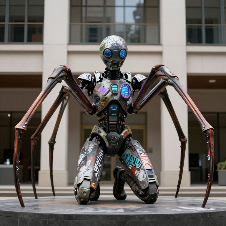 A futuristic sculpture of a humanoid figure with spider-like appendages, covered in graffiti and digital screens, sits on a pedestal in front of a building.