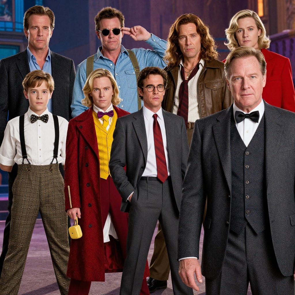 Male movie characters to dress up as, featuring a variety of iconic costumes from classic to modern films, realistic textures, vibrant colors, cinematic lighting, detailed accessories, dynamic poses, set against dramatic movie-themed backgrounds.