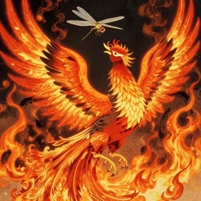 Digital illustration of a massive, vivid red and orange phoenix soaring over a destroyed cityscape, casting a dark silhouette below.