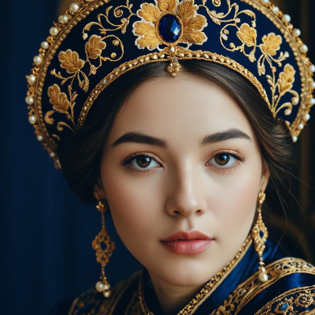 A close-up portrait of a young woman wearing an elegant baroque-inspired garment with rich textile textures, the garment featuring intricate detailed embroidery in warm golden and deep blue colors, a matching golden embroidered headpiece framing her face, soft warm lighting highlighting her delicate facial features, soft focused background creating a luxurious atmosphere