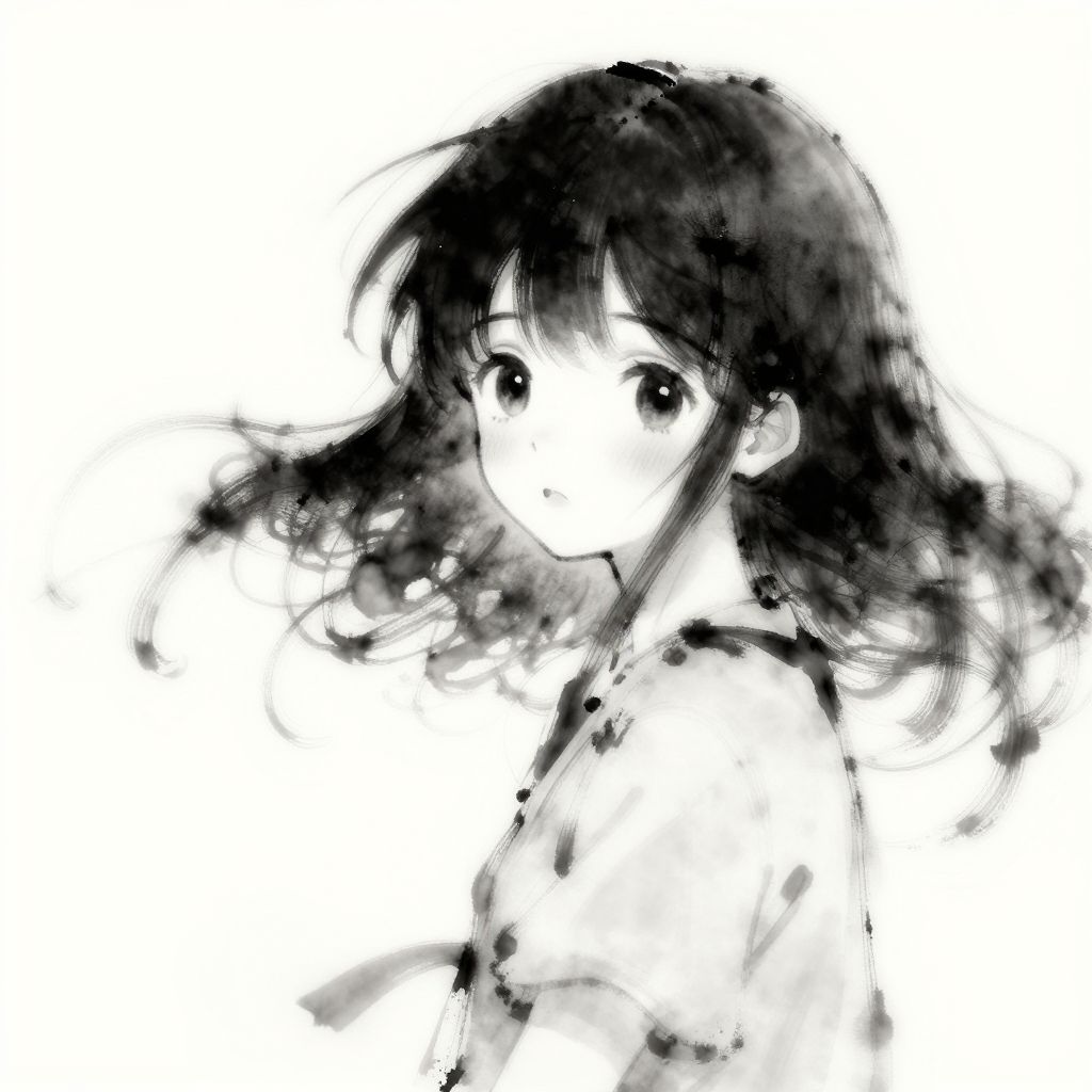 Absurdres, highres, ultra detailed, (1girl:1.3), kawaii expressive brush strokes, ink wash, gradation, poetic atmosphere, delicate balance, fluid motion