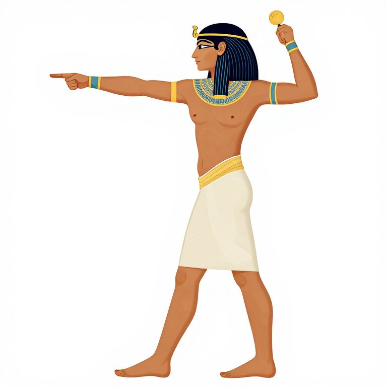 This digital illustration depicts a male ancient Egyptian figure standing in profile. He has dark blue, straight hair adorned with a gold headpiece. His skin is a warm brown tone. He is shirtless, revealing a lean, muscular build, and wears a white kilt with a yellow waistband. His right arm is extended forward, pointing, while his left arm holds a small golden ankh above his head. He has green and blue beaded necklaces and matching armbands. The background is pure white, highlighting the figure. The style is reminiscent of traditional Egyptian art with bold, flat colors and simple shading.