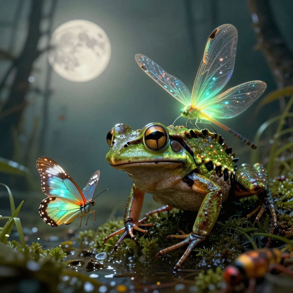 Photorealistic digital artwork of a glowing, iridescent frog with fairy-like wings, a luminescent bug, and a moonlit forest background