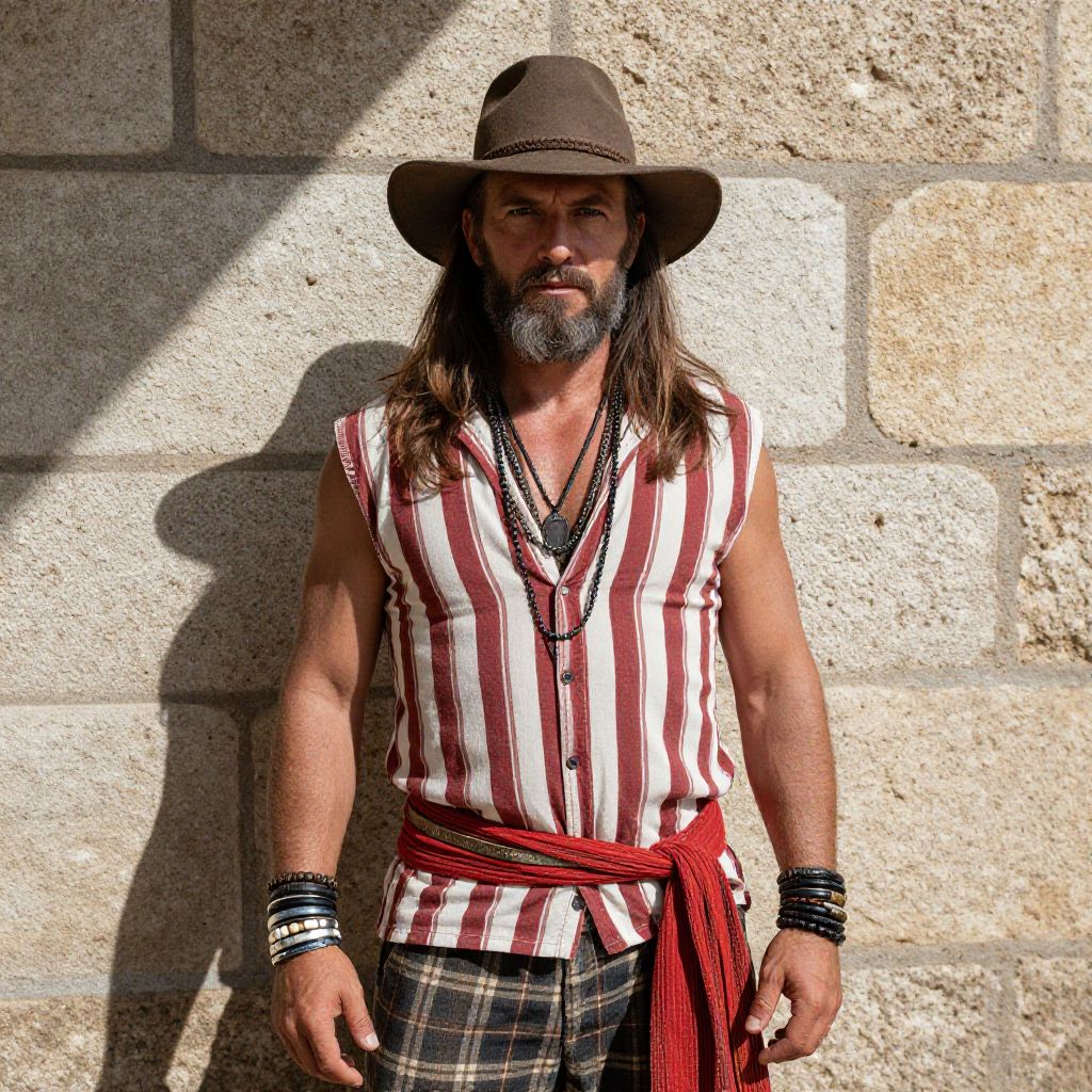 A photograph of a rugged man with long brown hair and a gray beard, wearing a wide-brimmed hat, sleeveless shirt with red and white stripes, and plaid pants. He has multiple necklaces and bracelets, and a red sash around his waist. He stands in front of a stone wall, bathed in bright sunlight, casting defined shadows. His intense gaze is directed at the camera.