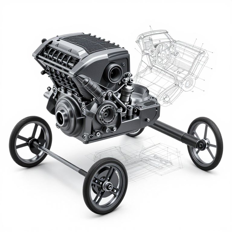 Photorealistic CGI of a sleek, black, high-performance engine with four wheels, detailed metal textures, and intricate mechanical components.