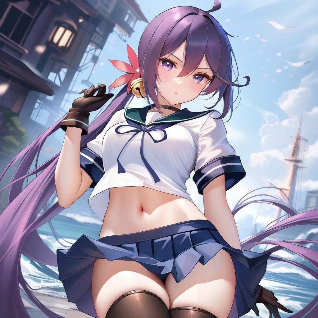 Akebono kai ni (kancolle), kantai collection, 1girl, purple eyes, hair between eyes, purple hair, very long hair, long hair, side ponytail, ahoge, hair flower, hair bell, serafuku, serafuku, blue skirt, black thighhighs, pleated skirt, black gloves, short sleeves, blue sailor collar, jingle bell, by artist meion, animagine
