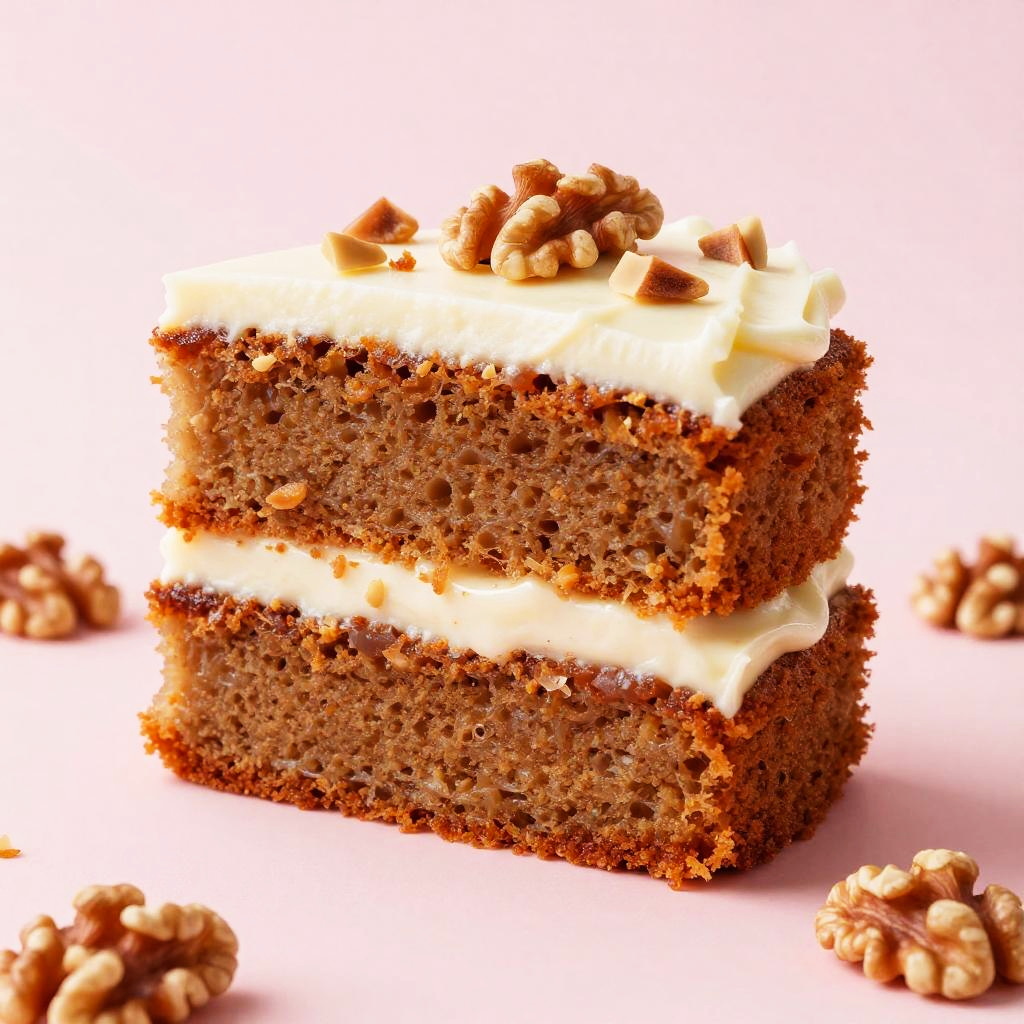 A hyper-realistic stack of carrot cake slices, surrounded by cream cheese frosting and chopped walnuts. Pink pastel background, product photography style, ultra-detailed and mouthwatering