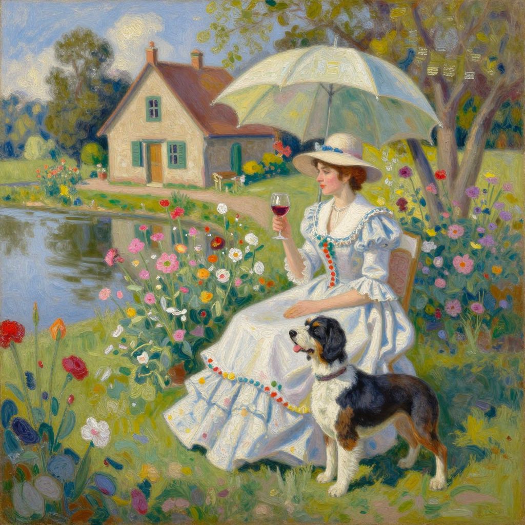 In this impressionistic oil painting, inspired by Sorolla, a beautiful garden scene unfolds with a country cottage nestled near a serene lake. A woman, elegantly dressed in a frilly dress and a wide-brimmed hat, sits under an umbrella, holding a glass of wine. Beside her, a fancy dog gazes attentively. The scene is bathed in soft, painterly tones, with textured backgrounds and a palette knife technique that adds depth and dimension. The sun casts a warm glow, highlighting the vibrant colors of the flowers and the woman's attire. The overall composition is balanced, with the woman and her dog positioned centrally, creating a harmonious interplay of elements that draw the viewer's eye across the scene. The detailed textures and soft lighting evoke a sense of tranquility and leisure, capturing a moment of peaceful enjoyment in a picturesque setting.