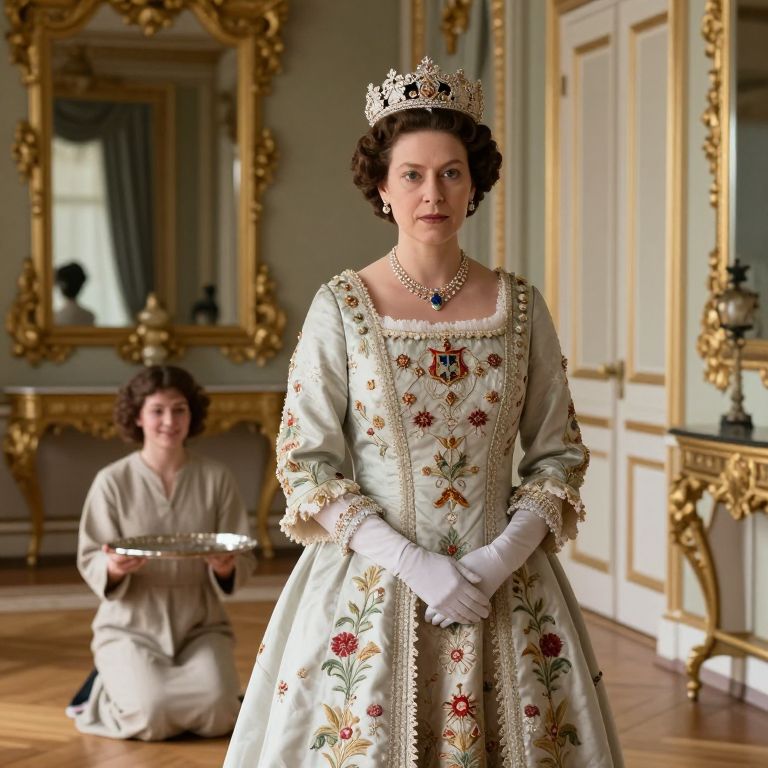 A realistic portrait-style photograph capturing a queen in a royal gown with hand-embroidered floral patterns and royal insignia, standing in front of a grand mirror in an opulent palace hallway, while a young domestic servant in plain linen clothes is seen in the background, kneeling and polishing a silver tray, the queen has delicate features, a strong chin, and a calm, authoritative gaze, the servant has a round face, soft curls, and a humble, earnest smile, emphasizing the contrast between luxury and simplicity.