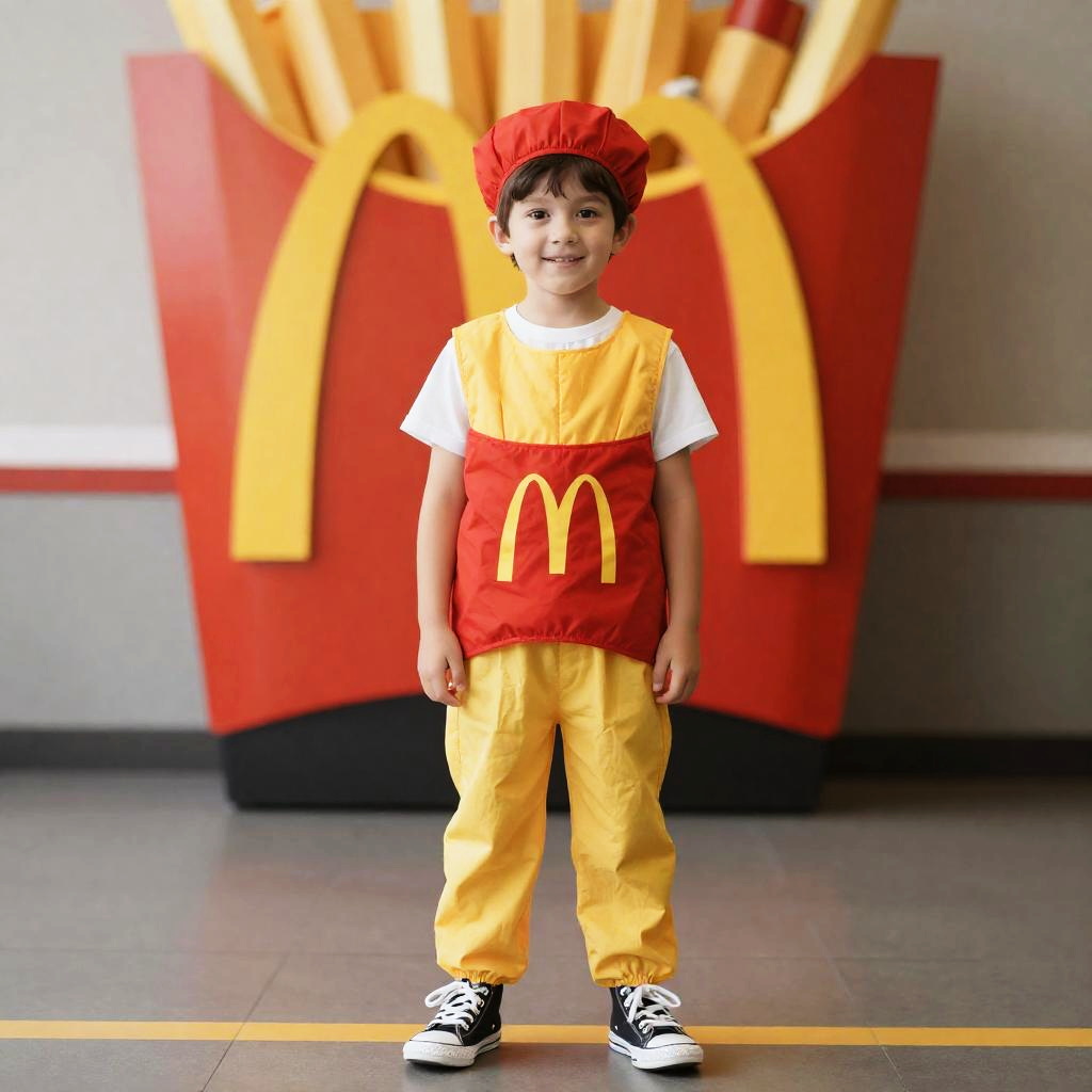 Fast Food Fries Kid Costume, boy in a mcdonald costume standing in front of a mcdonalds