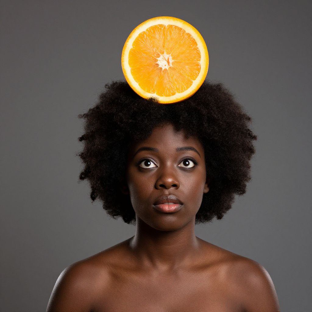 An African-inspired woman adorned with a radiant orange slice perched whimsically atop her afro, defying gravity in a surreal celebration of color and imagination.