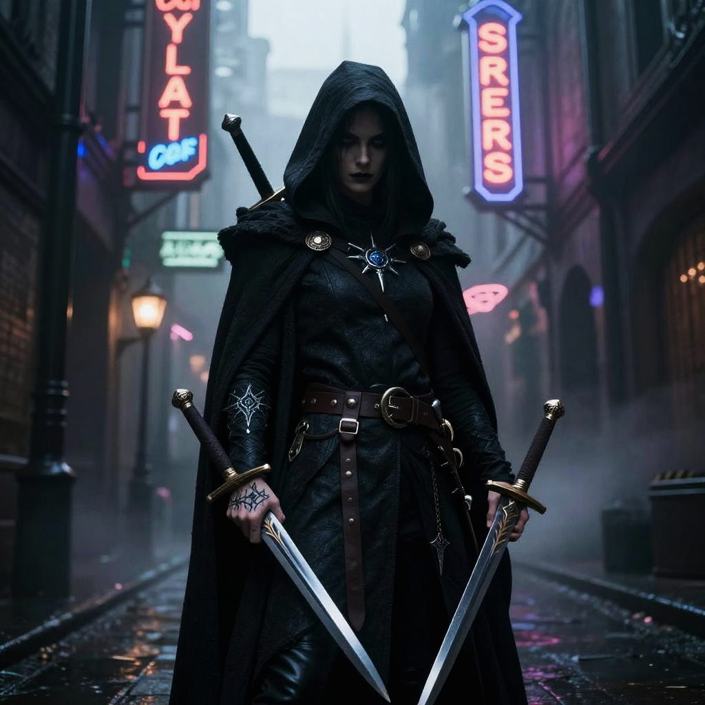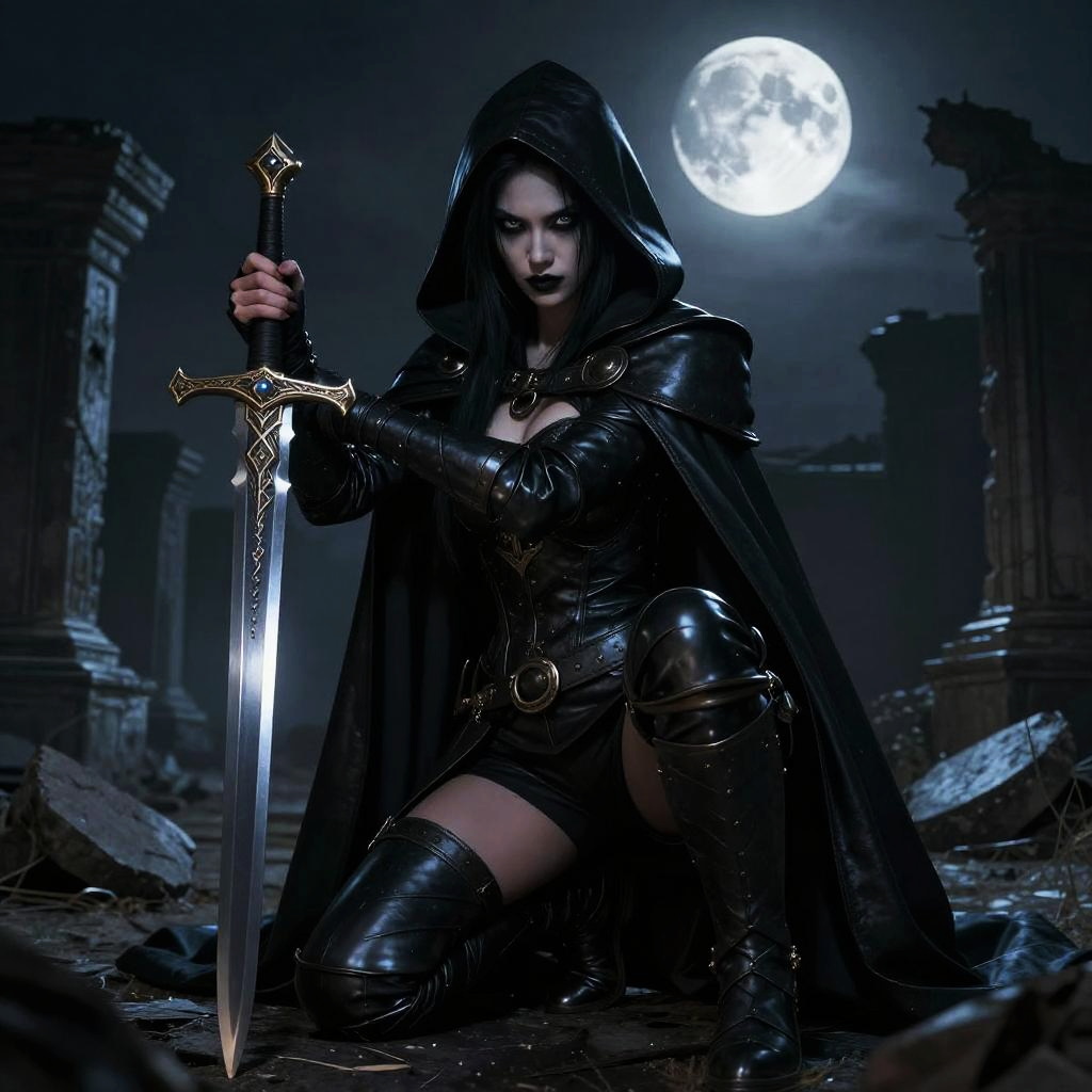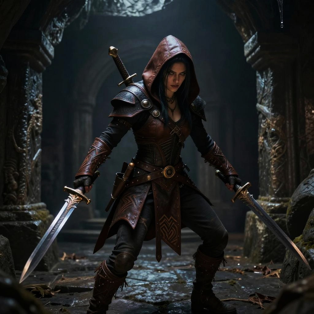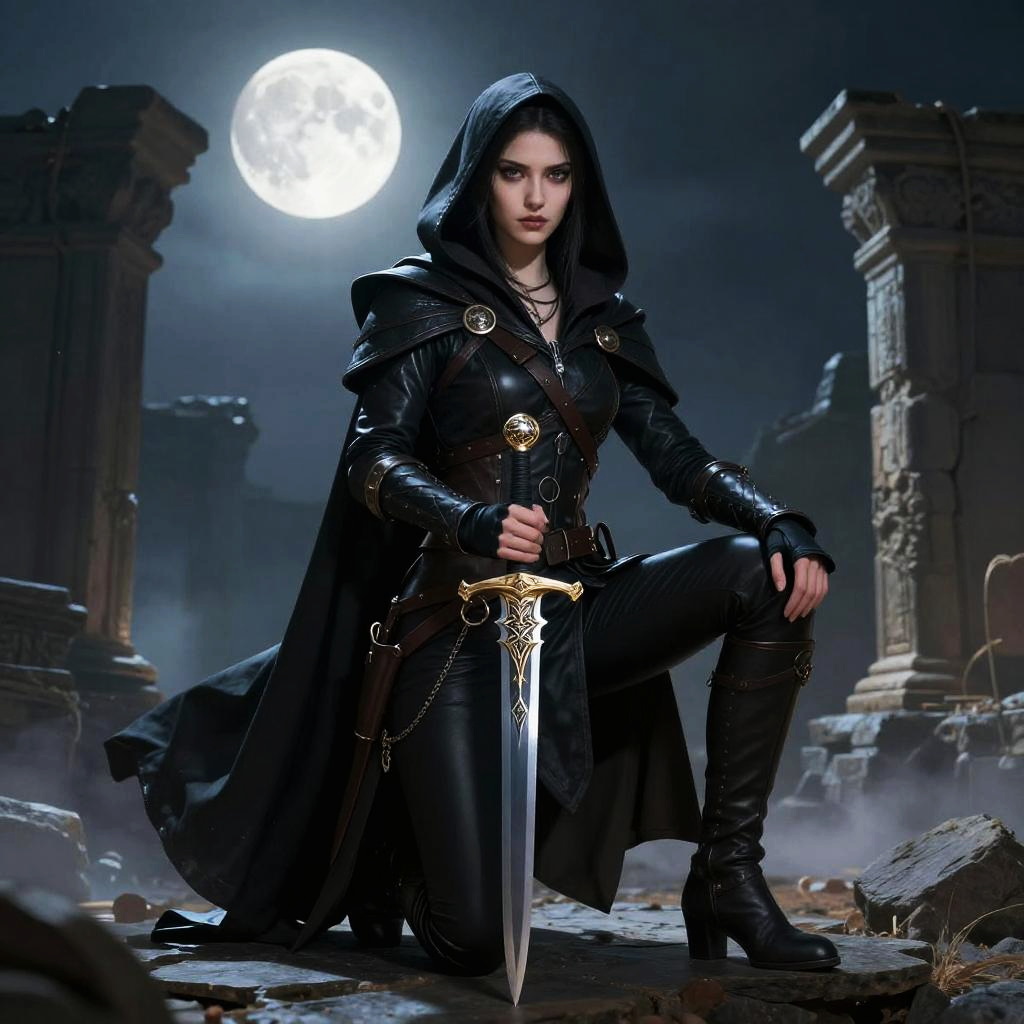 AI DnD character art generator illustrating a graceful half-elf rogue cloaked in dark leather, poised on ancient ruins under moonlight, mysterious aura, intricate dagger designs, realistic style with soft lighting and atmospheric mist.