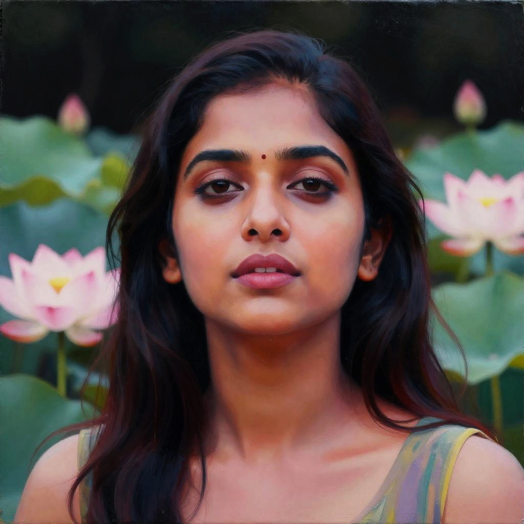 Realistic photo.A high-definition pop art painting of a radiant Indian woman's visible face, facing the camera and looking up against a tranquil lotus pond on a low-key black background. The artwork employs soft, pastel colors with dramatic dripping paint effects that convey intensity and emotion. The composition blends a serene natural setting with pop art aesthetics, creating a bold and visually captivating piece with a sense of energy and impact. realistic photo