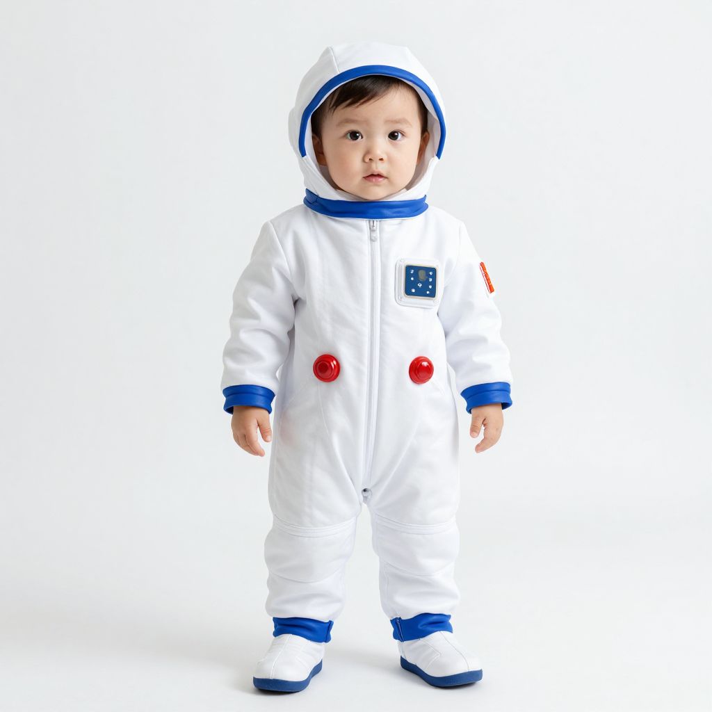 Photograph of a toddler in a white astronaut suit with blue trim, red buttons, and a hood, standing against a plain white background.