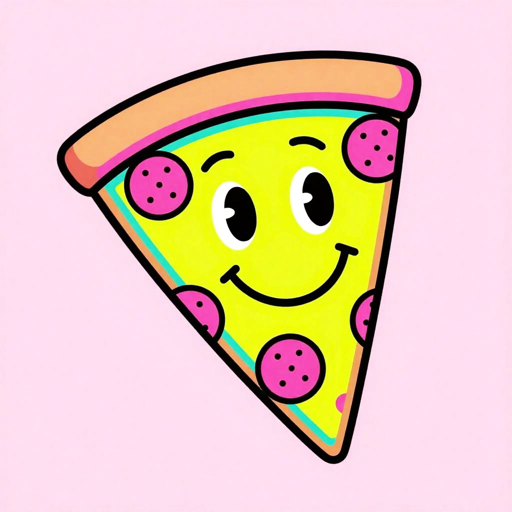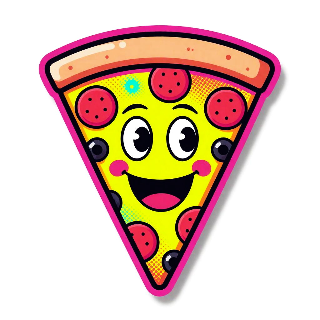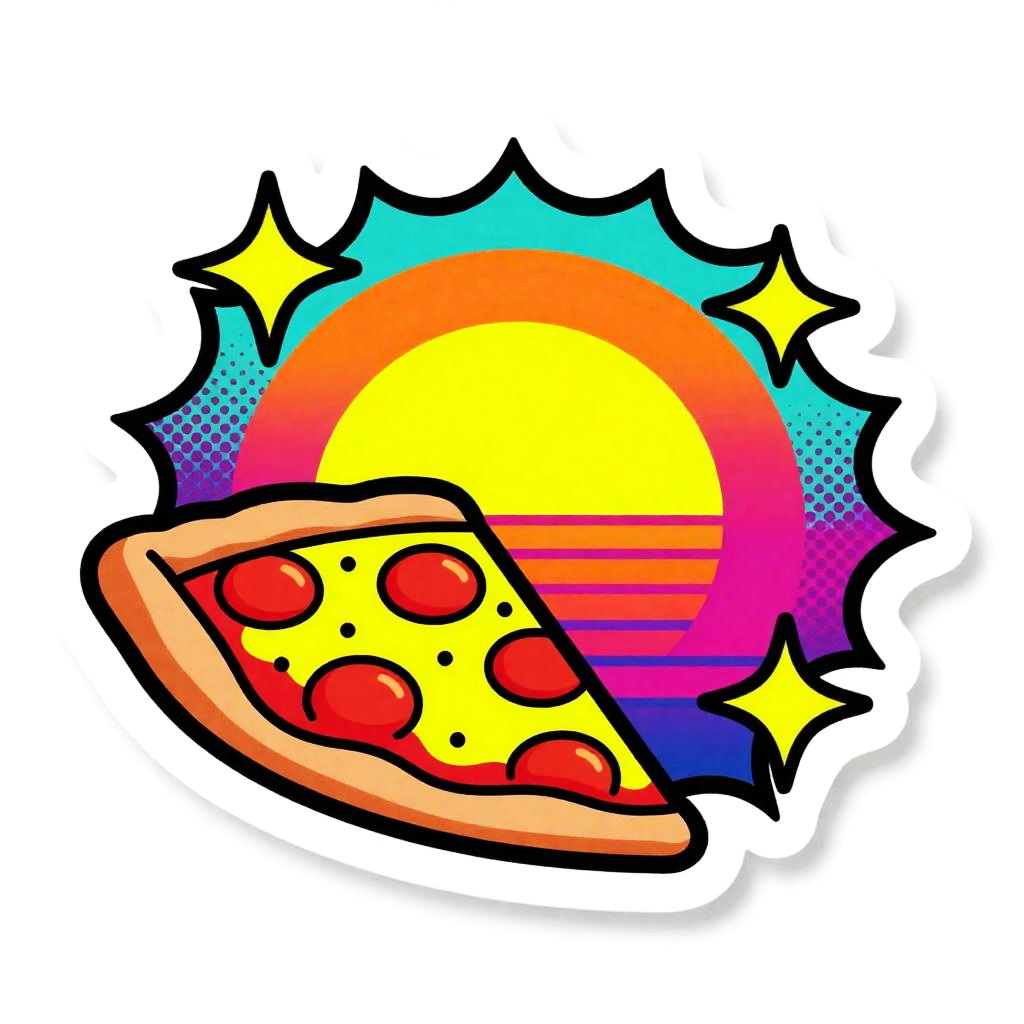 Whole pizza with one slice mid-air, smiling and sporting a tiny chef's moustache, speech bubble reading "Yum!" in pop art style, sunset-warm vibrant palette (coral, tomato red, mustard yellow, teal accents), thick bold black outlines with stippled halftone and dotted comic-burst accents, retro 1980s Memphis pop-art / vintage sticker vibe, isolated on white background with a subtle die-cut white border and small comic burst behind the pizza, cheerful, whimsical and playful