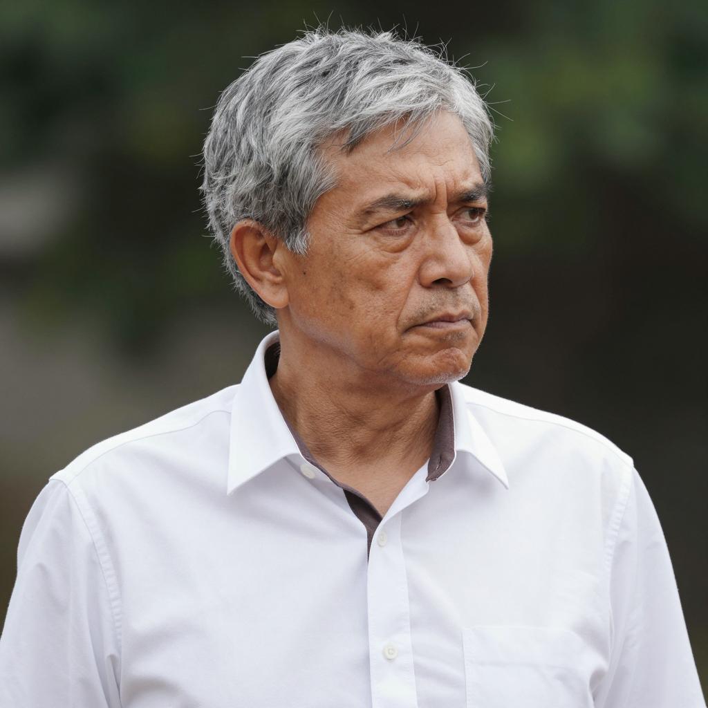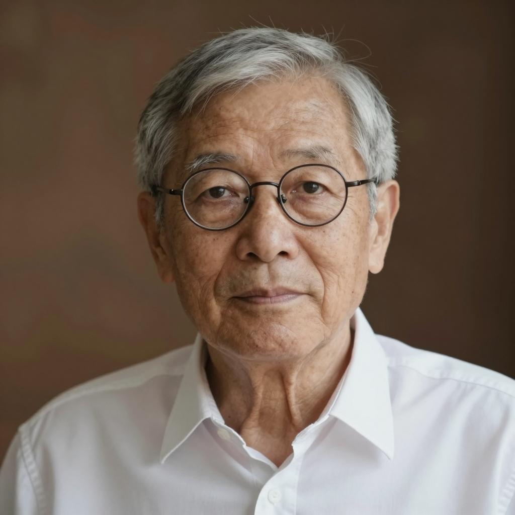 Close-up portrait of an elderly man with graying hair and a bushy mustache. The man's intense green eyes stand out against his weathered skin. Lighting creates strong shadows on the left side of his face, with a blurred brown background adding to the focus on his facial features. He wears a dark jacket over a light-colored shirt.