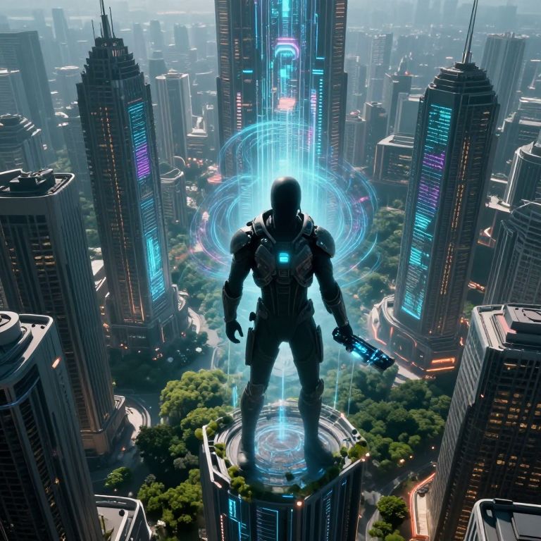 A futuristic cityscape is depicted from an aerial viewpoint, showcasing an awe-inspiring blend of technology and nature as towering skyscrapers rise like ancient trees within an urban forest. The scene is bathed in an ethereal glow from holographic displays that cascade across the buildings' facades like waterfalls. A mysterious figure emerges from the shadows, clad in a high-tech exosuit, their silhouette framed against a backdrop of swirling digital art reminiscent of classic science fiction book covers. This enigmatic character holds a sleek, advanced device pulsing with an eerie blue light, hinting at untold secrets hidden within this surreal metropolis.
