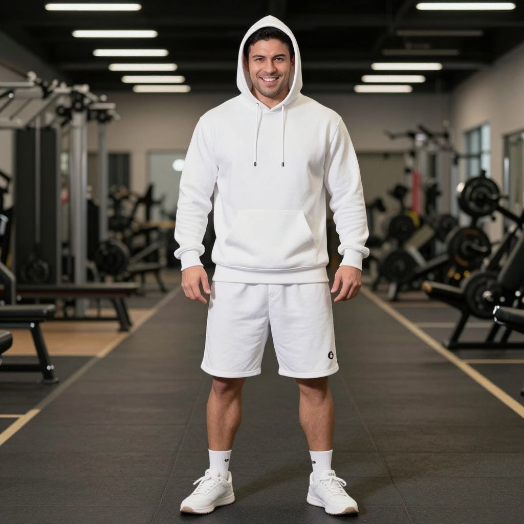 Photograph of a smiling, fit man in a white hoodie, shorts, and sneakers, standing in a modern gym with exercise equipment.