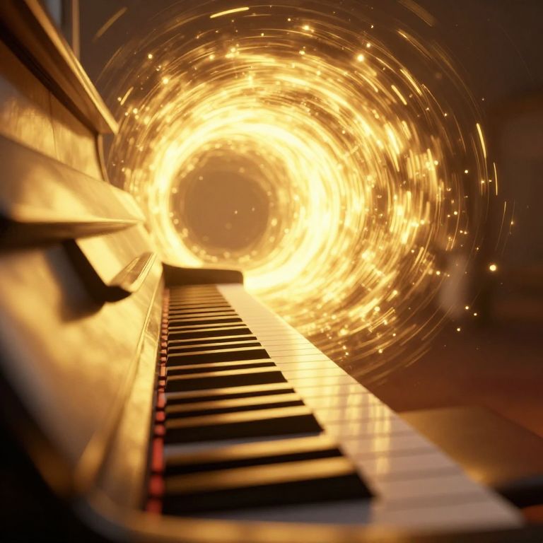 A mesmerizing 3D render depicts a piano bathed in radiant golden light, its keys leading into a brilliant, glowing wormhole that seems to transport them into parallel dimensions, creating a surreal and otherworldly visual effect.