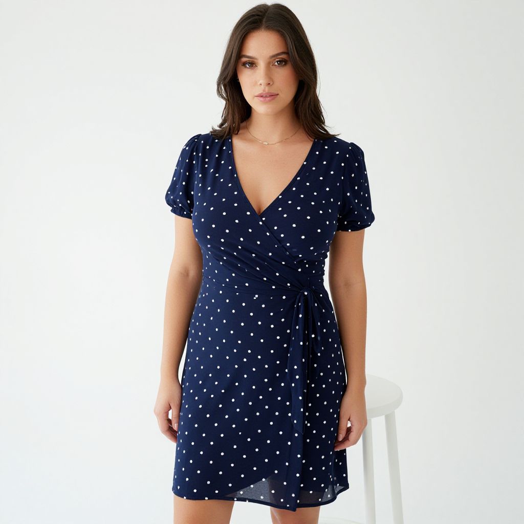 "Woman, contemporary casual, navy blue wrap dress with white polka dots, V-neckline, short puff sleeves, tie at waist, knee-length skirt, simple gold necklace, studio background with white stool and white flooring. Sexy. Pretty face and beаutiful eyes. Big breasts."