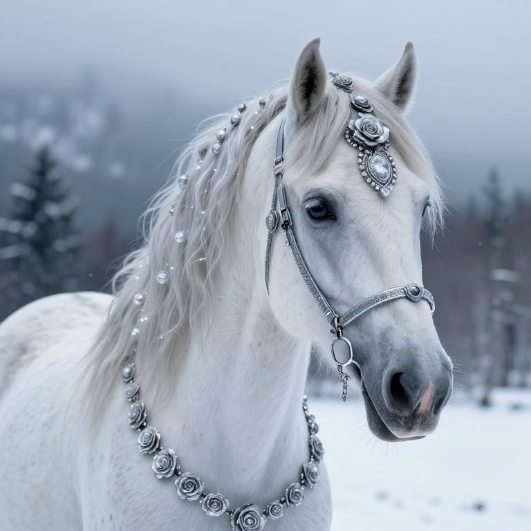 A hyperdetailed, intricately adorned white horse with long flowing mane, silver spots, and sharp piercing gaze, wearing jewels and silver roses, stands in an epic winter landscape, bathed in magical, ambient lighting.