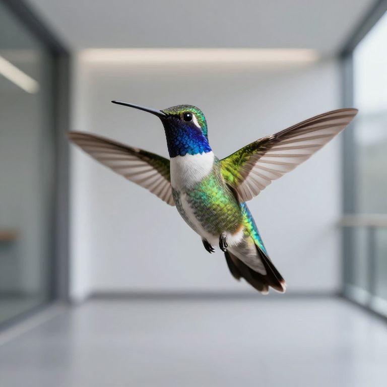 Photograph of a vibrant hummingbird in mid-flight, set against a blurred, modern indoor background with glass walls and bright lighting. The bird has iridescent green feathers on its head and back, a white underbelly, and a blue patch on its throat. Its wings are fully extended, showing brown and white feathers. The hummingbird's long, straight beak is pointed forward. The background features a sleek, minimalist hallway with a glossy floor, creating a contrast with the bird's vivid colors. The image has a high-contrast, slightly surreal style.