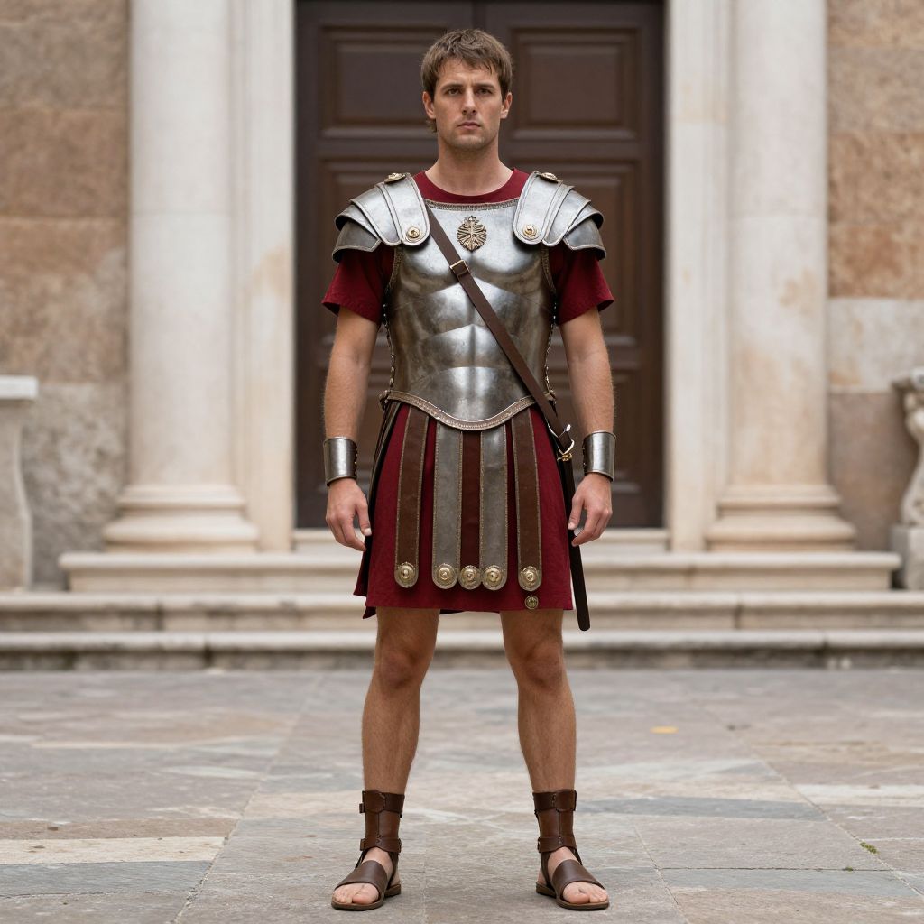 Homemade roman outfit, man in roman armor standing in front of a building