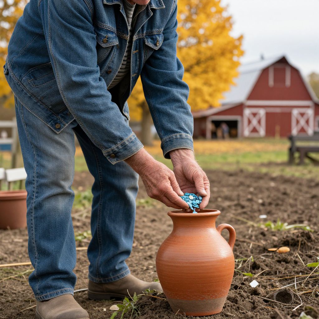 A realistic photograph of an elderly man in a worn denim jacket and work boots standing in a farmyard, gently placing a handful of small blue chips into a handmade clay pot, with a backdrop of golden autumn leaves and a red barn in the distance, soft warm light creating a natural, earthy atmosphere.